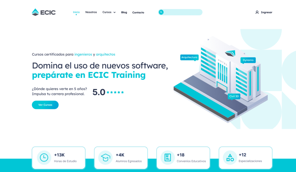 Creamos un sitio web para Grupo ECIC, una plataforma especializada en cursos de arquitectura e ingeniería, resaltando su excelencia académica y su oferta de servicios a través de un diseño vanguardista y una experiencia de usuario optimizada, logrando resultados sobresalientes.