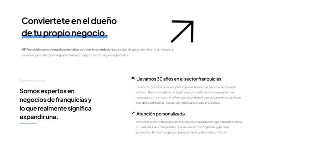 La solución de MP Franchising fue desarrollar una página web profesional, atractiva y fácil de navegar que destaque la propuesta de valor de MP Franchising y facilite la comunicación con potenciales franquiciados. La página web mostrará de manera clara los servicios ofrecidos, casos de éxito y testimonios, generando confianza y atrayendo a potenciales interesados en el modelo de franquicias.
